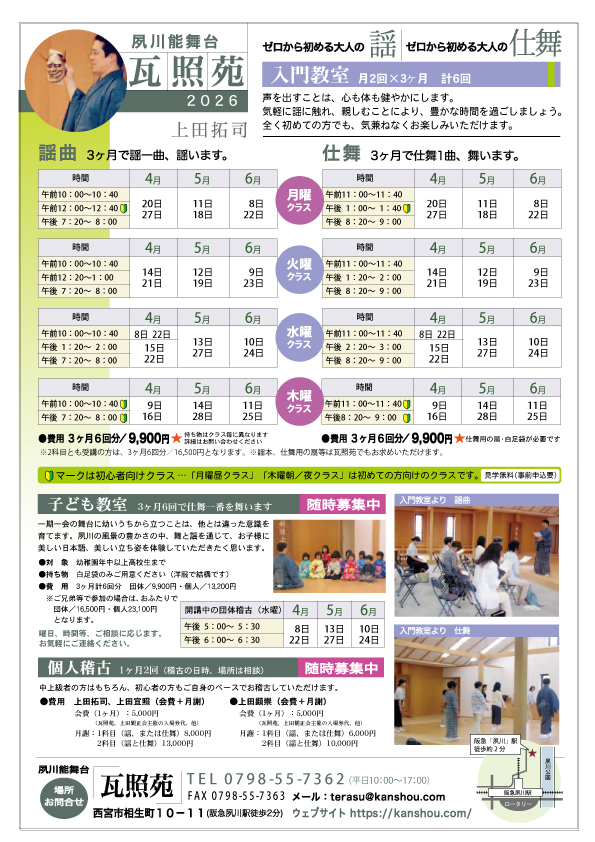 【入門教室】2026年4~6月の予定 2026.03.12 2026年4月からの入門教室の予定です。 ★マークは初心者向けクラスです。 ご見学(無料)ご希望の方は事前に事務所までお問い合わせください。 入門教室チラシカラー2026.04-06