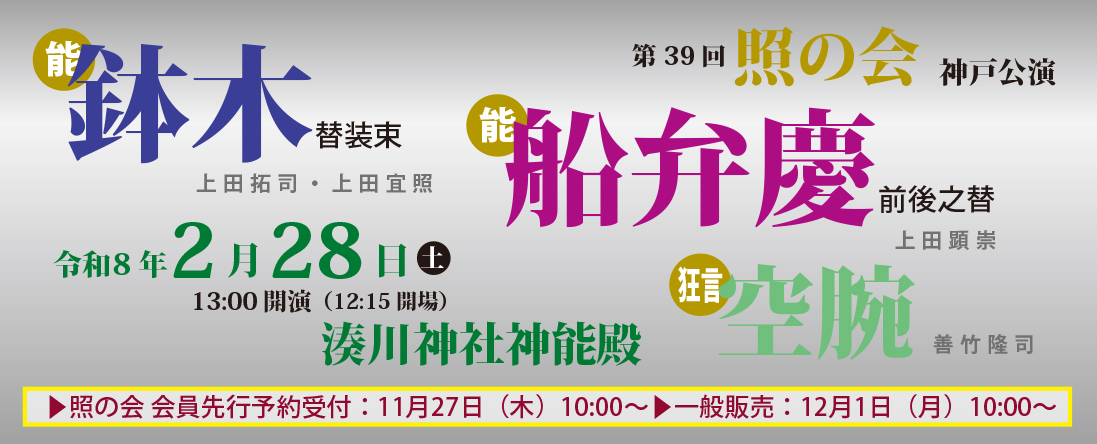 照の会について 次の時代の為に 阪神大震災にて神戸市長田区は大きな被害を受け、自宅も全壊しました。その時の体験より社会に対し、自分が出来ることを思索し、自分の子供たちとその世代のことを思い「次の時代のために」と題しその年の春、第1回照の会を、開催しました。 早逝した父照也の名にちなみ、また、照也が申しておりました「点を線にしたい」と言う言葉から「照の会」は照也と長男、宜照たちの時代を私を経て線につなぐという願いをこめて名付けました。 写真は「隅田川」シテ 上田照也 ▼直近の公演(画像クリックで詳細をご覧いただけます) チケットのお申し込みはこちら 会員制度について これまでの照の会